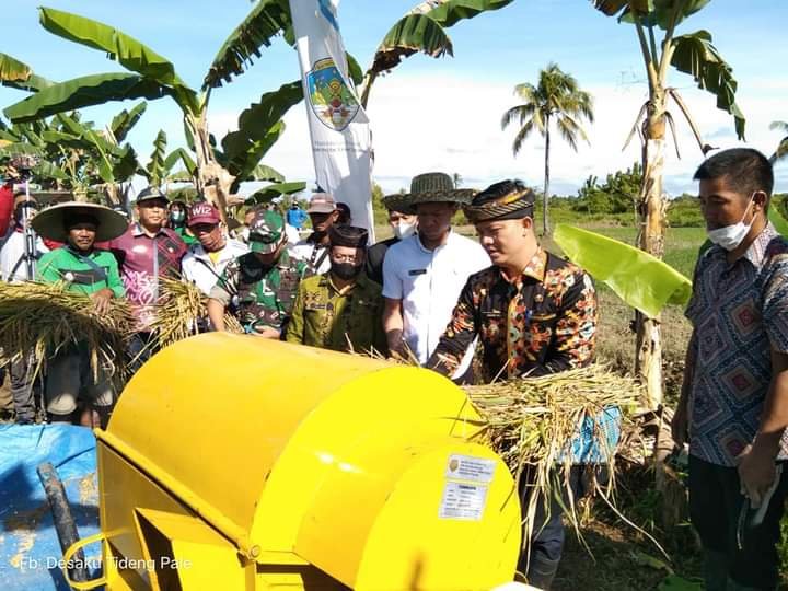 TANA TIDUNG – Bupati Kabupaten Tana Tidung, Ibrahim menghadiri panen padi sawah bersama kelompok tani semangat bagu di Desa Tideng Pale Seberang, Kamis (24/2/2022).