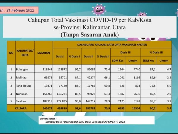 “Kabupaten Tana Tidung menduduki peringkat ketiga tertinggi dari cakupan vaksinasi Covid-19 di wilayah Provinsi Kalimantan Utara,” ujarnya kepada fokusborneo.com, Sabtu (26/2/2022).