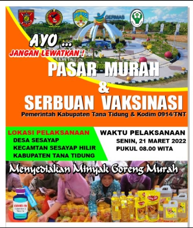 TANA TIDUNG – Kodim 0914/TNT bersama Pemda Kabupaten Tana Tidung menggelar serbuan vaksin Covid-19 dan pasar murah minyak goreng di Desa Sesayap, Kabupaten Tana Tidung, Senin (21/3/2022).