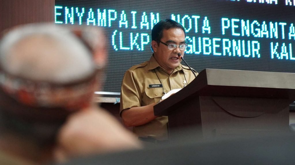 TANJUNG SELOR – Sekretaris Provinsi (Sekprov) Kaltara Dr H Suriansyah menyampaikan Nota Pengantar Laporan Keterangan Pertanggungjawaban (LKPj), pada Rapat Paripurna ke 6 di Kantor DPRD Kaltara, Senin (28/3/2022).
