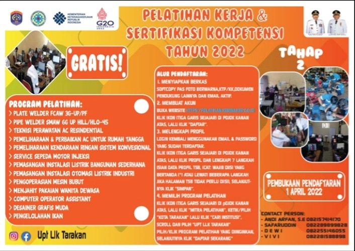 Kepala UPTD LLK Kota Tarakan Andi Arfan mengatakan pendaftaran pelatihan ini dibuka melalui aplikasi sisnaker atau melalui website Https:/pelatihan.kemnaker.go.id.