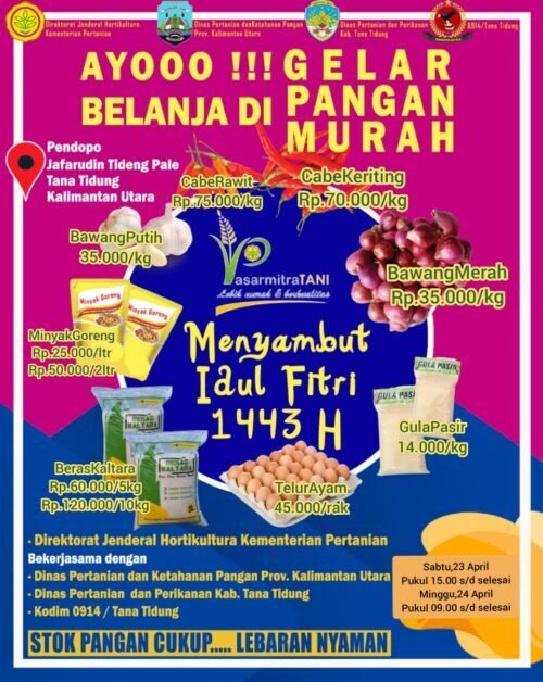 TANA TIDUNG – Jelang Hari Raya Idul Fitri 1443 Hijriah, Pemerintah Kabupaten Tana Tidung (KTT) melaksanakan gelar pangan murah (GPM), di Pendopo Djaparudin Tideng Pale, Sabtu (23/4/2022).
