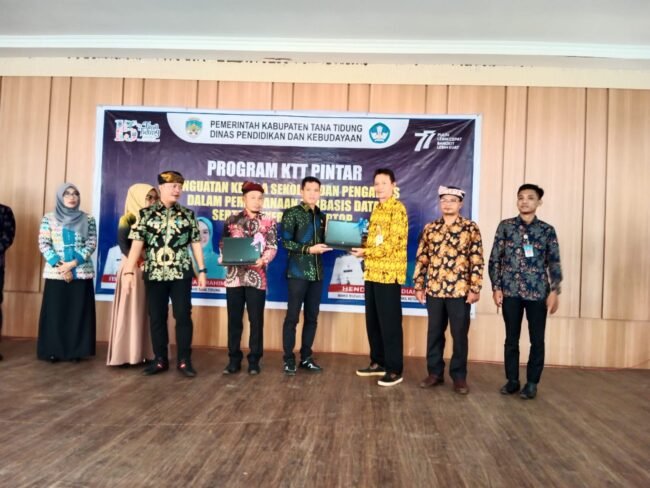 TANA TIDUNG – Ketua DPRD Tana Tidung Jamhari menghadiri acara program KTT pintar dalam penguatan kepala sekolah dan pengawas dalam perencanaan berbasis data serta penyerahan laptop di ruang Serbaguna Disdik Tana Tidung, Kamis (11/8/2022).