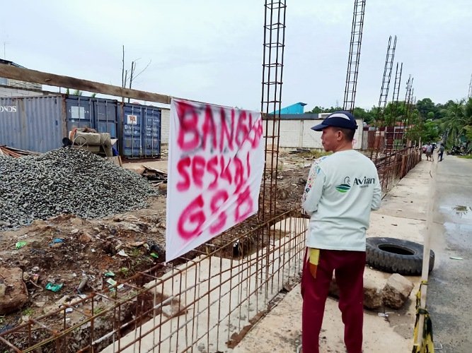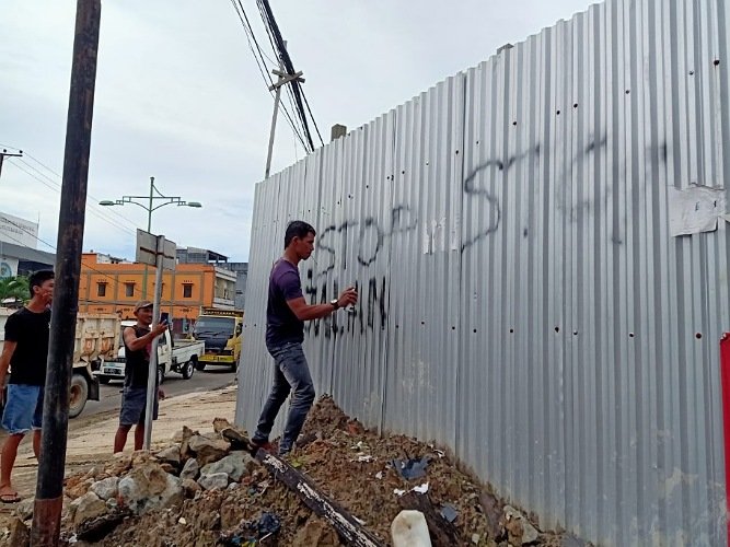 Warga yang datang ke lokasi, langsung membentangkan spanduk bertuliskan “Stop Kerja” di salah satu tiang besi cor bangunan pagar. Upaya ini, bentuk kekecewaan warga karena keluhannya tidak direspon pemiliknya.