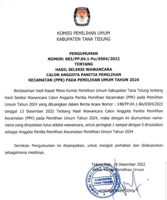 TANA TIDUNG – Komisi Pemilihan Umum (KPU) Kabupaten Tana Tidung umumkan 25 nama calon anggota Panitia Pemilihan Kecamatan (PPK) untuk pemilu 2024.