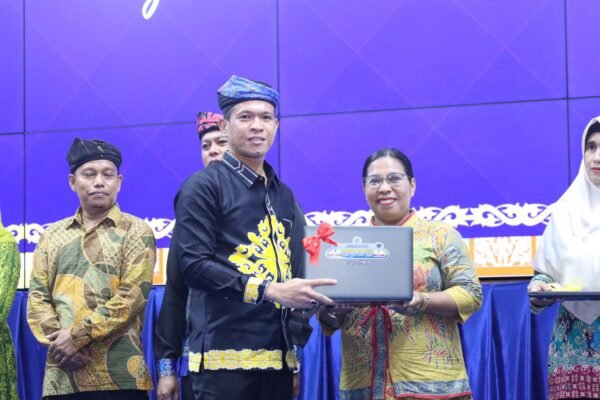 2 TAHUN KEPEMIMPINAN: Salah satu Program Unggulan KTT Pintar, Ketua DPRD Tana Tidung, Jamhari menyerahkan bantuan Laptop kepada Guru