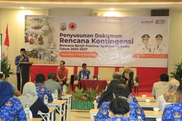 TANJUNG SELOR – Sekretaris Provinsi (Sekprov) Kalimantan Utara (Kaltara) Dr H Suriansyah, M.AP., membuka secara resmi Penyusunan Dokumen Rencana Kontingensi Bencana Banjir Provinsi Kalimantan Utara Tahun 2023 – 2027 di Lantai 2 Ballroom Hotel Luminor, Selasa (17/10).
