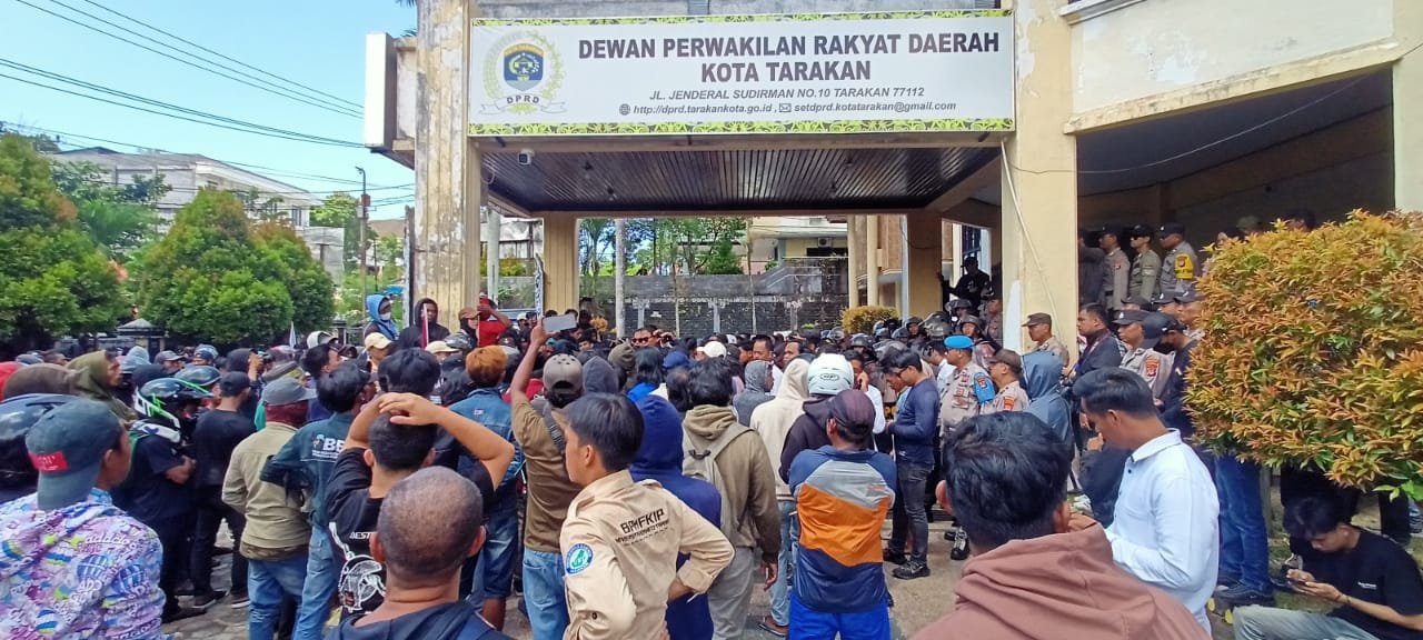TARAKAN – Ratusan masyarakat dan mahasiswa yang tergabung dalam Aliansi Bersatu Rakyat Pesisir gelar aksi demontrasi di depan gedung Dewan Perwakilan Rakyat Daerah (DPRD) Kota Tarakan di Jalan Jenderal Sudirman, Kota Tarakan, Senin (23/10/2023).