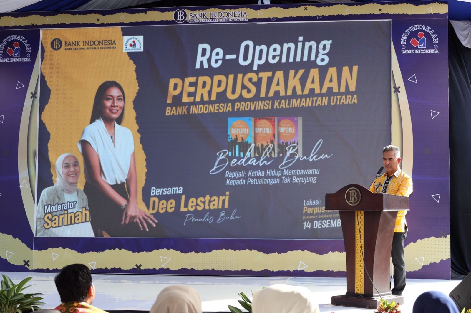TARAKAN – Kantor Perwakilan Bank Indonesia (KPwBI) Provinsi Kalimantan Utara (Kaltara) menggelar re-opening perpustakaan yang dirangkai dengan bedah buku “Rapijali” oleh penulis Dee Lestari di halaman belakang Kantor BIÂ Provinsi Kaltara, Kamis (14/12/23).