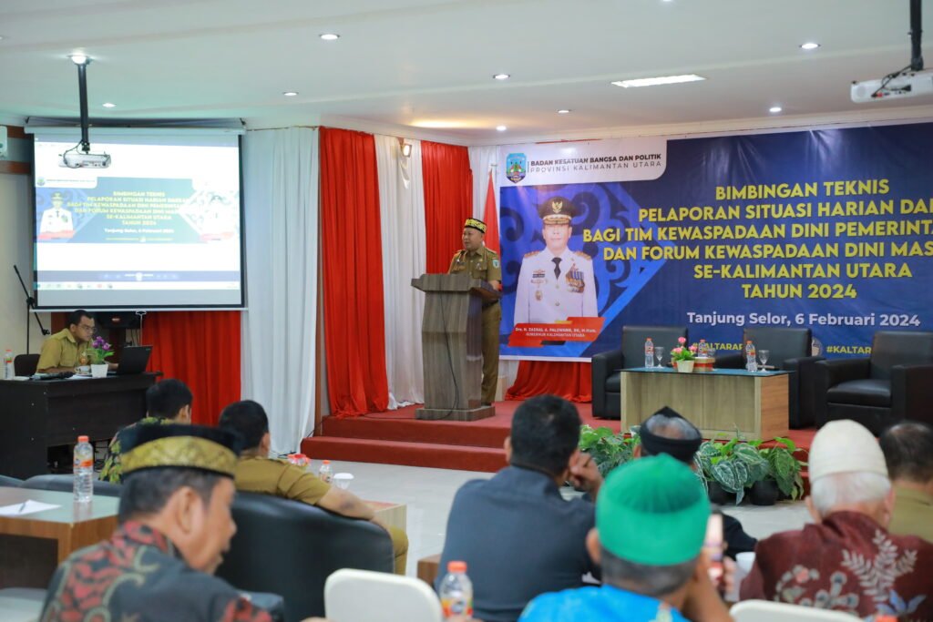 TANJUNG SELOR – Demi pelaksanaan Pemilu dapat berjalan dengan tertib dan aman, Badan Kesatuan Bangsa dan Politik (Kesbangol) Kaltara menggelar Bimbingan Teknis (Bimtek) Pelaporan Situasi Harian Daerah Bagi Tim Kewaspadaan Dini Pemerintah Daerah dan Forum Kewaspadaan Dini Masyarakat se-Kalimantan Utara di Hotel Grand Pangeran Khar, Selasa (6/2).