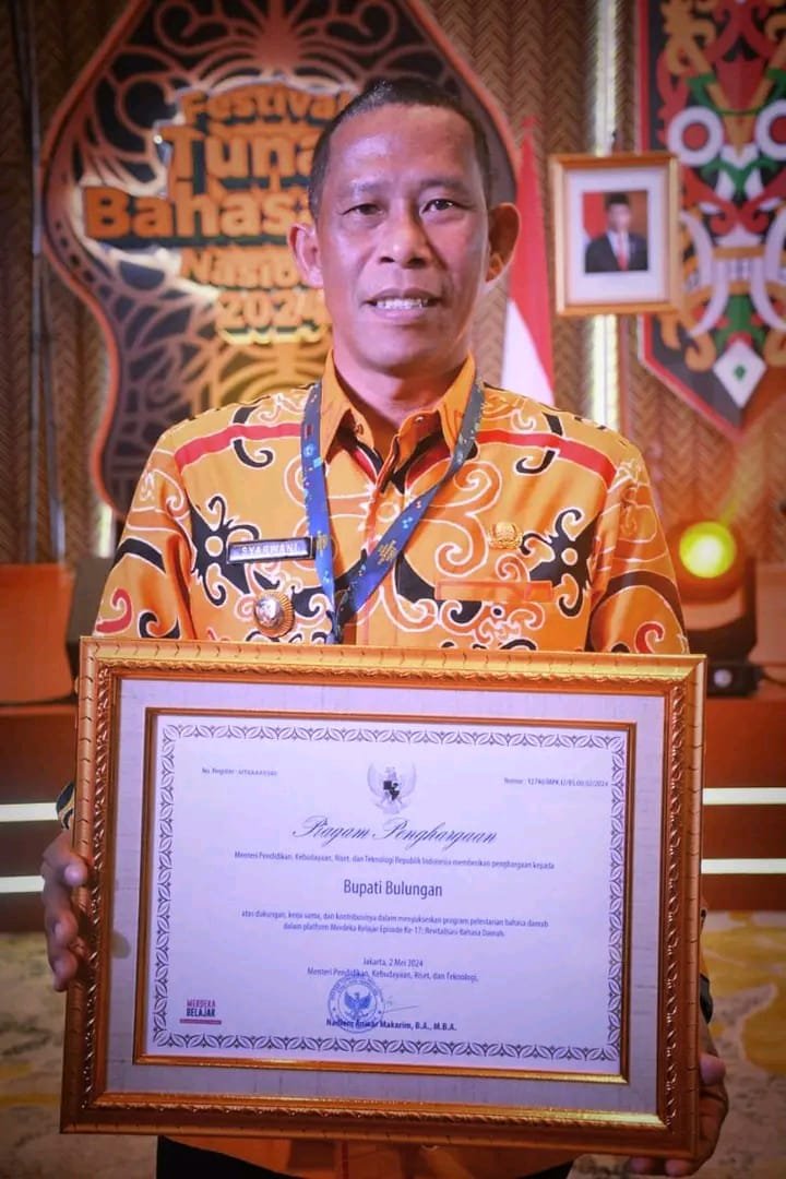 BULUNGAN – Pemerintah Kabupaten (Pemkab) Bulungan menerima penghargaan Revitalisasi Bahasa Daerah dari Kementerian Pendidikan, Kebudayaan, Riset dan Teknologi (Kemendikbud-Ristek) RI. Penghargaan tersebut diserahkan pada Acara Festival Tunas Bahasa Ibu Tingkat Nasional (FTBIN) di Hotel Sultan, Jakarta, Kamis (2/5/24).