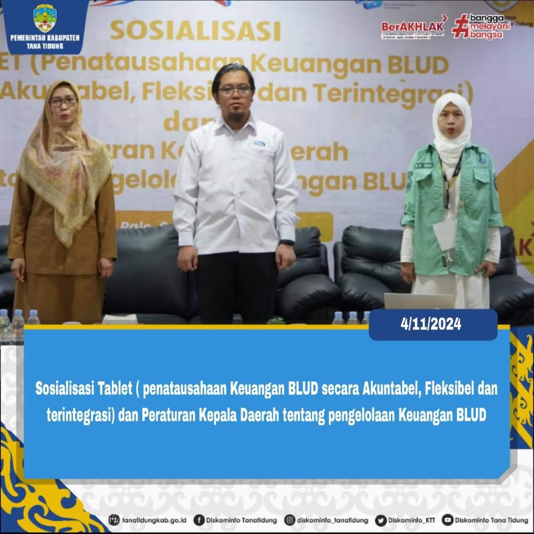 TANA TIDUNG – Pemerintah Kabupaten Tana Tidung melaksanakan sosialisasi Penatausahaan Keuangan Badan Layanan Umum Daerah (BLUD) secara Akuntabel, Fleksibel dan terintegrasi dan Peraturan Kepala Daerah tentang pengelolaan Keuangan BLUD, Senin (4/11/2024).