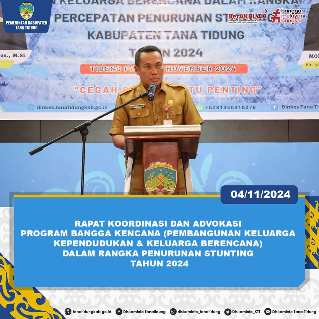 TANA TIDUNG – Rapat Koordinasi dan Advokasi Program Bangga Kencana (Pembangunan Keluarga Kependudukan & Keluarga Berencana) dalam rangka penurunan stunting tahun 2024, dibuka secara resmi oleh Asisten II Kabupaten tana Tidung, Senin (4/11/2024).
