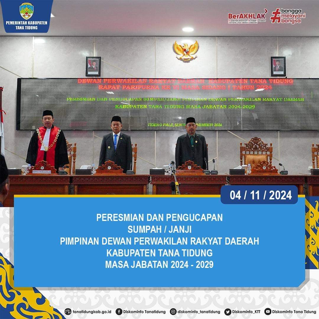 “Saya ucapkan selamat kepada saudara yang telah dipercaya untuk menduduki jabatan sebagai pimpinan DPRD Kabupaten Tana Tidung. Pelantikan ini merupakan amanah besar yang harus saudara emban dengan penuh tanggungjawab, sebagai perpanjangan tangan rakyat di parlemen dan saudara memiliki peran strategis dalam menentukan arah kebijakan daerah yang bermuara pada kesejahteraan rakyat”. Ungkap Pjs. Bupati Tana Tidung.