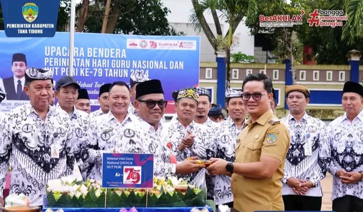TANA TIDUNG, – Memperingati Hari Guru Nasional 2024 dan HUT PGRI ke 79, Bupati Tana Tidung bertindak sebagai Pembina Upacara yang diikuti guru se-kabupaten Tana Tidung di Halaman Pendopo Djaparuddin, Senin (25/11/2024).