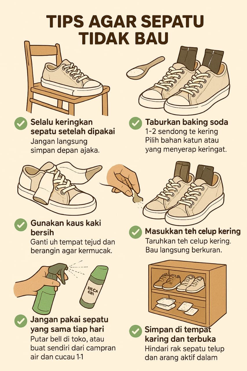 Sepatu bau sering jadi masalah yang bikin tidak percaya diri, apalagi saat harus buka sepatu di tempat umum. Tapi tenang, ada banyak cara simpel dan efektif untuk mengatasi masalah ini. Berikut tujuh tips yang bisa kamu coba agar sepatu tetap segar meski dipakai setiap hari.