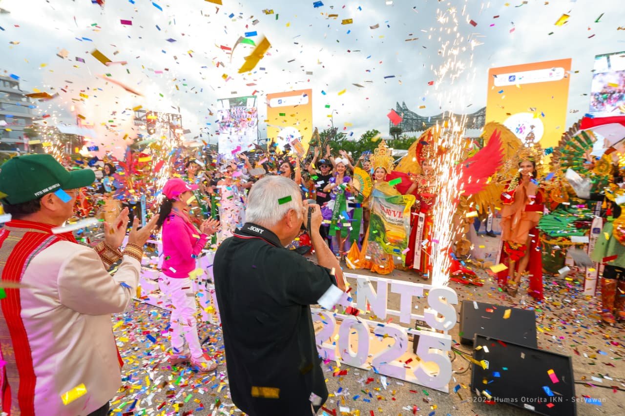 NUSANTARA,Fokusborneo.com– Drum dan simbal berbunyi, pemotongan pita merah warnai dimulainya rangkaian kegiatan Nusantara Fashion Carnival 2025 pada Selasa (19/08/2025) di Sentra Massa, Nusantara. Kepala Otorita Ibu Kota Nusantara (IKN), Basuki Hadimuljono dan Ketua Yayasan El John Pageants, Johnnie Sugiarto membuka kegiatan yang bertemakan _Bringing Indonesia To The World_ ini dengan sorak-sorai oleh para peserta dan pengunjung.
