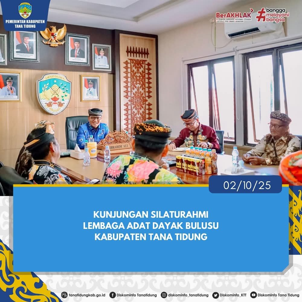 TANA TIDUNG, Fokusborneo.com – Pemerintah Kabupaten Tana Tidung terus memperkuat sinergi dengan unsur masyarakat adat. Pada Kamis (2/10/2025), Bupati Tana Tidung didampingi Wakil Bupati menerima kunjungan silaturahmi dari Lembaga Adat Dayak Bulusu Kabupaten Tana Tidung. Pertemuan berlangsung hangat di Ruang Rapat Bupati, Kantor Bupati Tana Tidung.