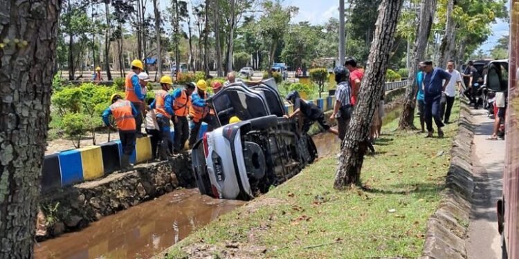 BULUNGAN – Sebuah kendaraan roda 4, Daihatsu Terios warna abu-abu masuk parit, di Jalan Sengkawit, Kecamatan Tanjung Selor, Kabupaten Bulungan, Rabu (8/10/2025).