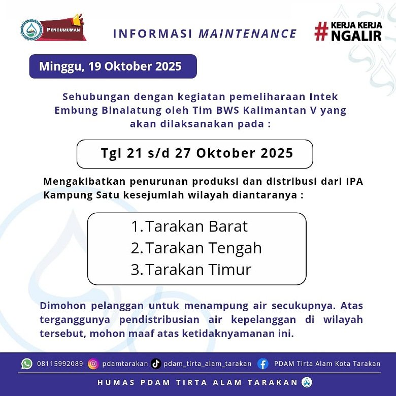 Selama pemeliharaan, suplai air baku dari Embung Binalatung ke Sistem Penyediaan Air Minum (SPAM) PDAM Tirta Alam Tarakan dihentikan sementara.