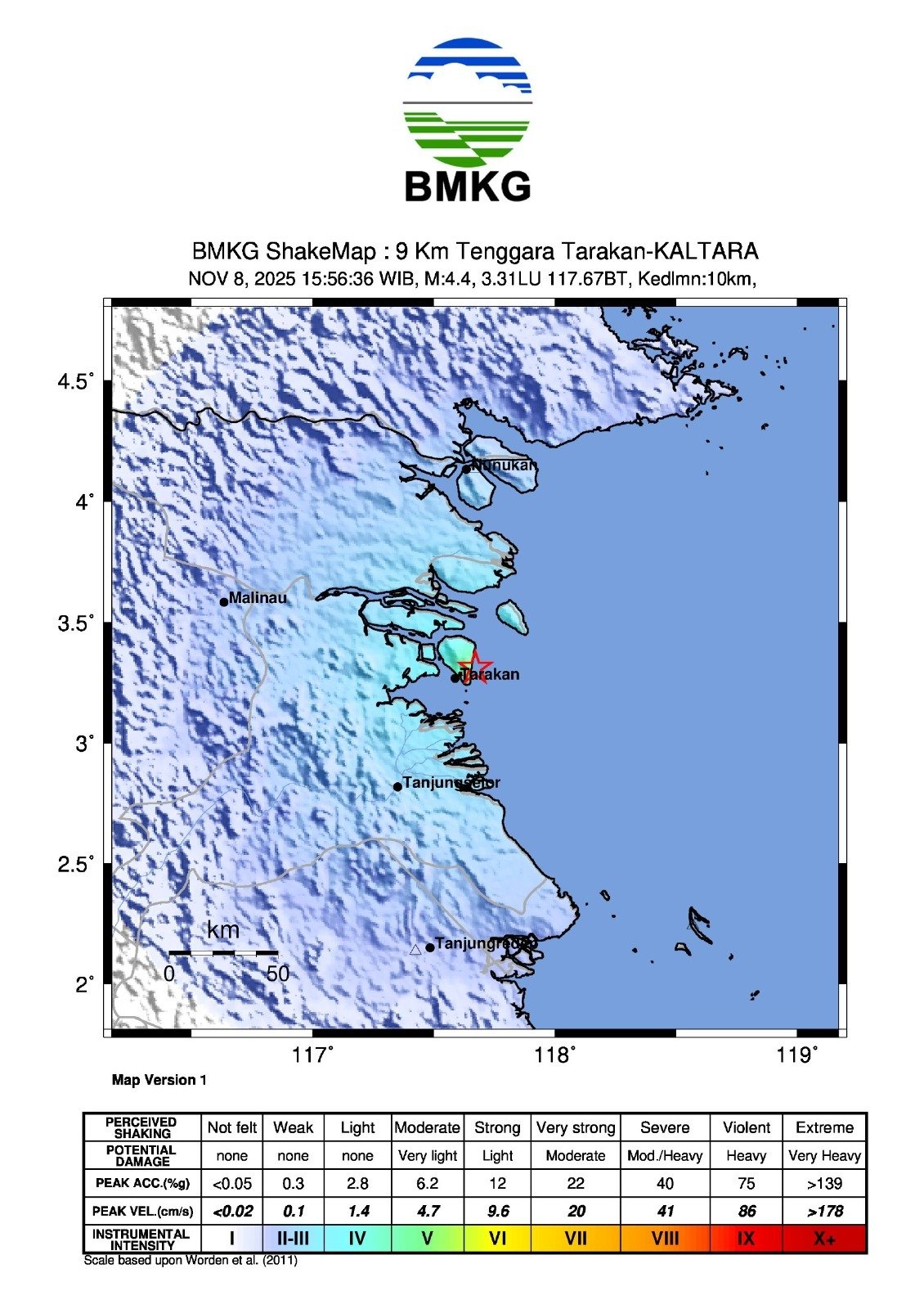 “Selain di Tarakan, guncangan juga dirasakan di Tanjung Selor dan Tana Tidung dengan intensitas III–IV MMI, serta di Nunukan dan Tanjung Redeb, Berau dengan intensitas II–III MMI,” kata Rasmid lagi.