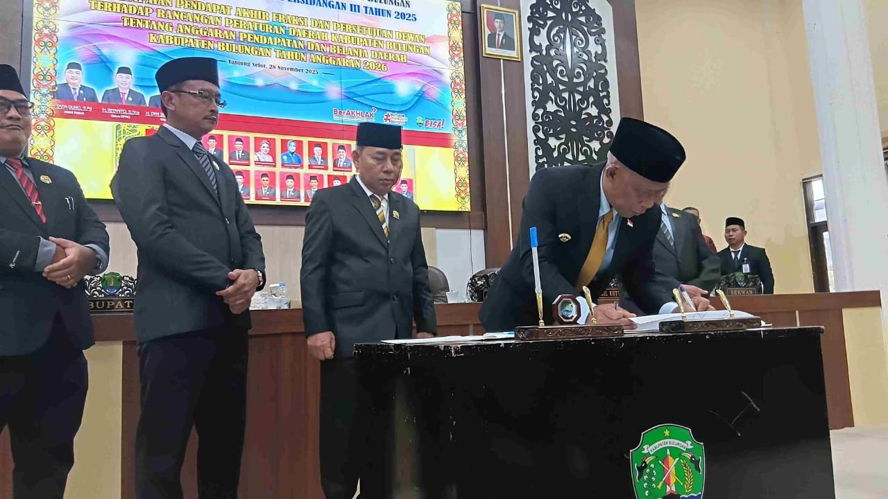 Bupati Bulungan, Syarwani, menandatangani persetujuan bersama DPRD terhadap APBD 2026 dalam Rapat Paripurna, Jumat (28/11/2025).
