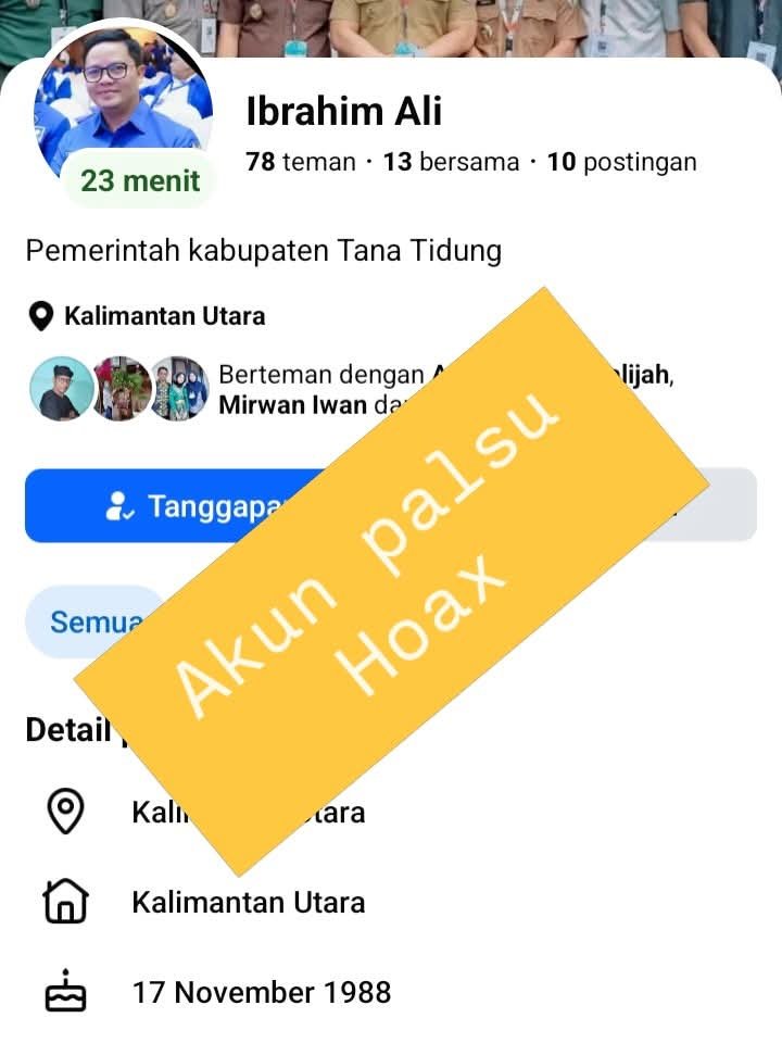 TANA TIDUNG, Fokusborneo.com – Nama Bupati Tana Tidung, Ibrahim Ali, kembali dicatut oleh pihak tak bertanggung jawab melalui akun palsu yang beredar di media sosial.