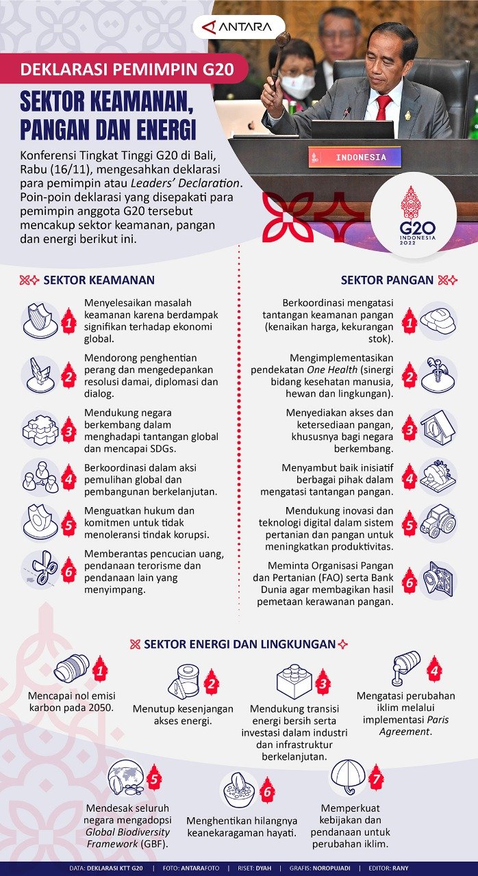 Info Grafis: Konferensi Tingkat Tinggi G20 di Bali, Rabu (16/11), mengesahkan deklarasi para pemimpin atau Leaders� Declaration. Poin-poin deklarasi yang disepakati para pemimpin anggota G20 tersebut mencakup sektor keamanan, pangan dan energi berikut ini.
