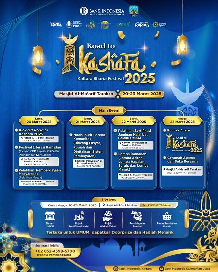 TARAKAN – Bank Indonesia (BI) Provinsi Kalimantan Utara (Kaltara) akan menggelar Kaltara Sharia Festival (Kashafa) 2025 dari tanggal 20-23 Maret 2025 di Halaman Masjid Al Ma’arief, Selumit, Kecamatan Tarakan Tengah, Kota Tarakan.