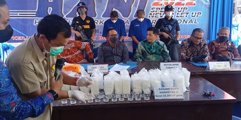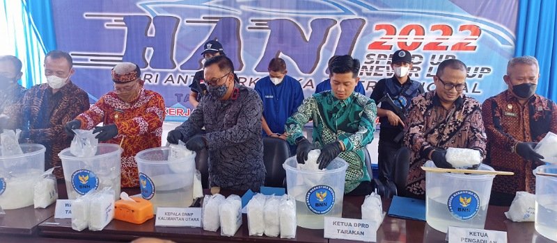 TARAKAN – Dalam rangka peringatan Hari Anti Narkoba Internasional (HANI) Tahun 2022, Badan Narkotika Nasional Provinsi (BNNP) Kaltara musnahkan puluhan kilogram barang bukti Narkotika jenis sabu dan pil ekstasi, Senin (27/6/2022).