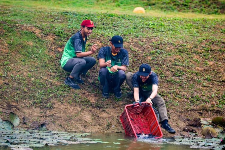 “Ada beberapa jenis ikan yang kita tebar di sini sebagai sumber pangan protein hewani. Kegiatan ini akan terus berlanjut di embung-embung lain, dengan pemetaan yang jelas antara ikan konsumsi dan ikan konservasi, termasuk ikan lokal endemik Kalimantan,” ujar Lenggono.