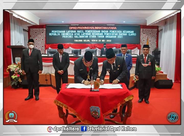 Dalam paripurna ini, dilaksanakan penandatanganan berita acara dan penyerahan LHP BPK RI atas laporan keuangan Pemprov Kaltara tahun anggaran 2021 diberikan langsung Anggota VI BPK RI Dr. Pius Lustrilanang, S.IP., M.Si., CfrA., CSFA kepada Ketua DPRD Provinsi Kaltara Albertus Stefanus Marianus, ST dan Gubernur Kaltara Drs H. Zainal Arifin Paliwang, SH., M.Hum.