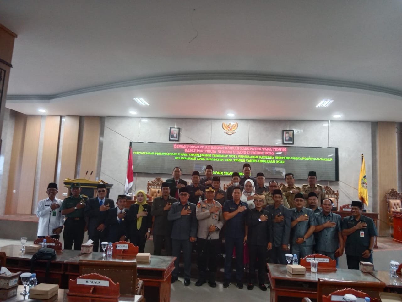TIDENG PALE – Ketua DPRD Kabupaten Tana Tidung Jamhari memimpin dan membuka Rapat Paripurna Ke – VI DPRD Kabupaten Tana Tidung Masa Sidang II Tahun 2023 dengan agenda “Penyampaian Pemandangan Umum Fraksi-Fraksi Terhadap Nota Penjelasan Raperda Tentang Pertanggungjawaban Pelaksanaan APBD Kabupaten Tana Tidung Tahun Anggaran 2022″, pada selasa (4/7/2023) di gedung DPRD KTT.