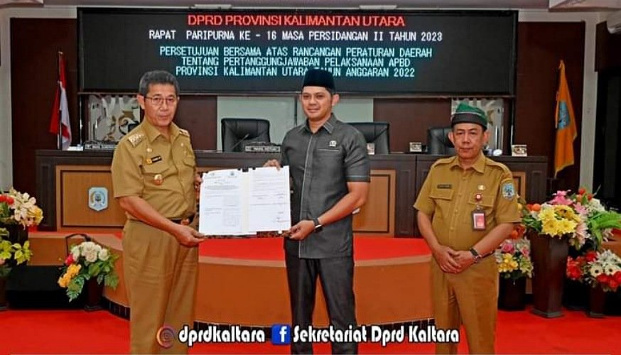 Rapat paripurna ke-16 ditutup dengan penandatanganan persetujuan Raperda tentang Pertanggungjawaban Pelaksanaan APBD Tahun Anggaran 2022 antara Pemprov dengan DPRD Provinsi Kaltara.(Hms)