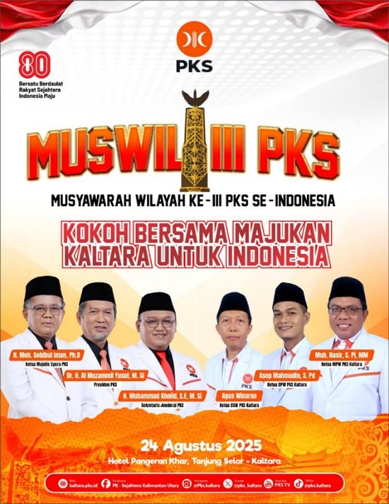 BULUNGAN, Fokusborneo.com – Dewan Pimpinan Wilayah (DPW) Partai Keadilan Sejahtera (PKS) Provinsi Kalimantan Utara (Kaltara) akan menggelar Musyawarah Wilayah (Muswil) ke-3 pada Ahad, 24 Agustus 2025.