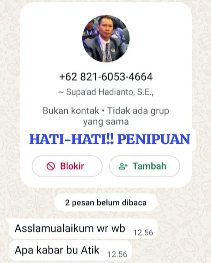 Pelaku diketahui menggunakan foto dan nama beliau untuk mengelabui korban melalui aplikasi pesan singkat WhatsApp (WA).