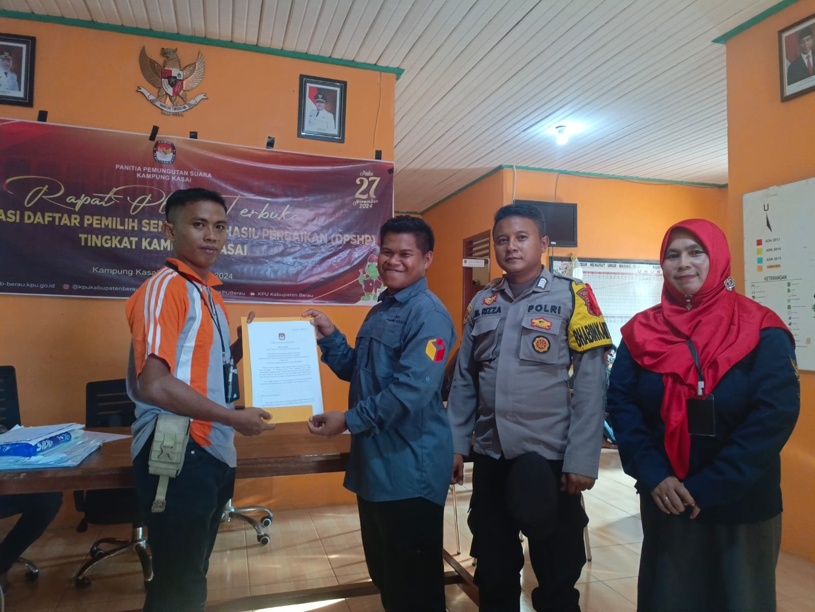 BERAU – Pada Kamis, 6 September 2024, pukul 15.45 hingga 16.45 WITA, berlangsung kegiatan Pleno Daftar Pemilih Sementara Hasil Perbaikan (DPSHP) Pemilihan Gubernur dan Wakil Gubernur serta Bupati dan Wakil Bupati Tahun 2024 di ruang rapat Kantor Pemerintah Kampung Kasai, Kecamatan Pulau Derawan, Kabupaten Berau. Kegiatan ini bertujuan untuk memastikan keakuratan data pemilih di tingkat kelurahan/kampung.