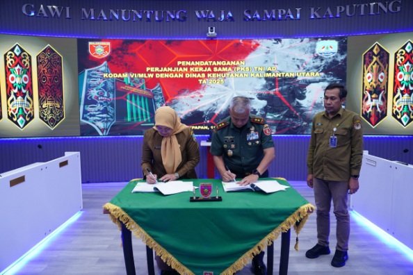 Kodam VI/Mulawarman dan Dinas Kehutanan Provinsi Kalimantan Utara resmi menandatangani Perjanjian Kerja Sama (PKS) terkait penggunaan kawasan hutan sebagai daerah latihan TNI AD. Acara ini dipimpin langsung oleh Pangdam VI/Mulawarman, Mayjen TNI Rudy Rachmat Nugraha, S.I.P., M.Sc., bertempat di Ruang Yudha, Makodam VI/Mlw, Selasa (11/03/25).