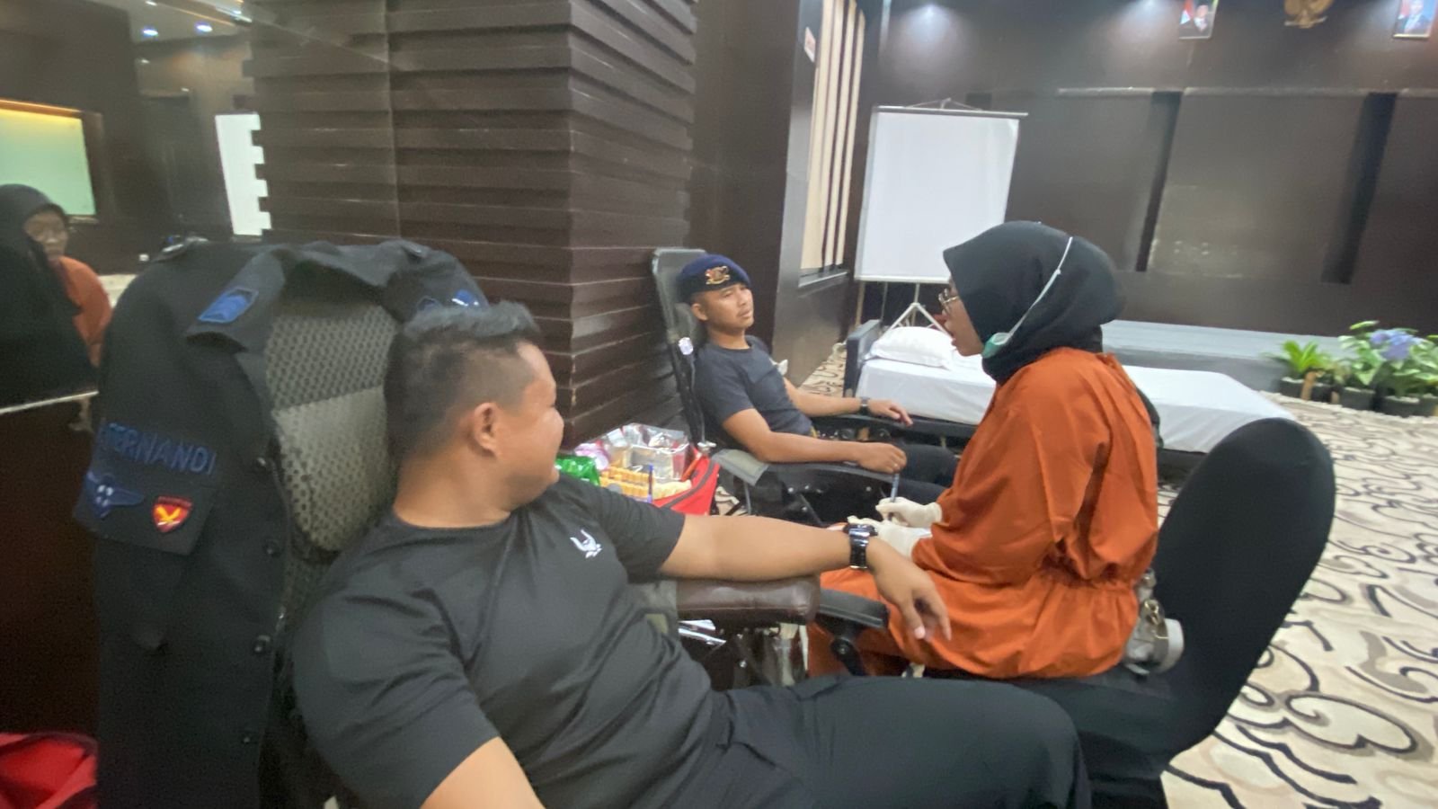 Personel Batalyon A Pelopor Satbrimob Polda Kaltim mengikuti kegiatan donor darah dalam rangka HUT Hotel Zurich Balikpapan 2025. Kegiatan sosial ini bekerja sama dengan PMI Balikpapan dan diikuti oleh berbagai elemen masyarakat. (Foto: Dok. Satbrimob Kaltim)