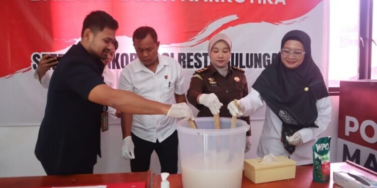 TANJUNG SELOR, Polda Kaltara, Polresta Bulungan – Satuan Reserse Narkoba (Sat Resnarkoba) Polresta Bulungan melaksanakan pemusnahan barang bukti narkotika jenis sabu-sabu seberat 55,85 gram dari tiga orang tersangka berinisial IR, SA, dan AF pada Rabu (22/10/2025).