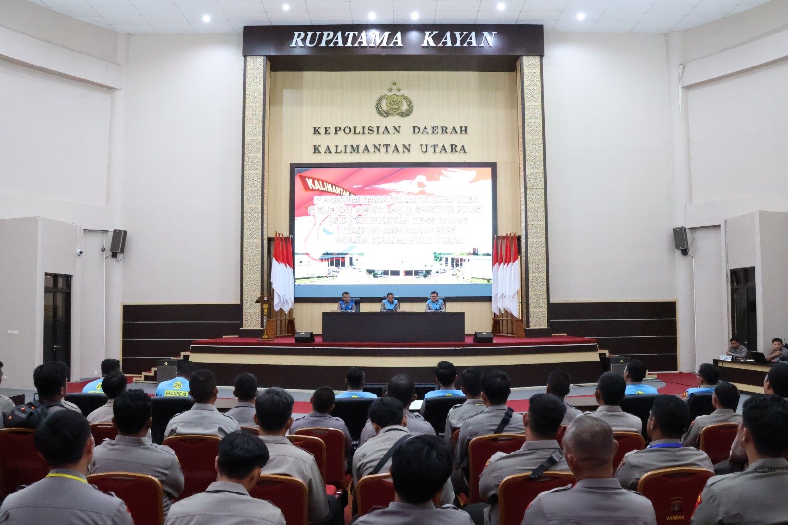 TANJUNG SELOR, Fokusborneo.com – Kepolisian Daerah Kalimantan Utara (Polda Kaltara) menggelar pengumuman nilai 13 komponen seleksi penerimaan Sekolah Inspektur Polisi (SIP) Angkatan 55 dan 56 Tahun Anggaran 2026. Kegiatan tersebut berlangsung di Gedung Bharadaksa pada Kamis, 4 Desember 2025, dengan suasana tertib dan penuh perhatian dari para peserta.
