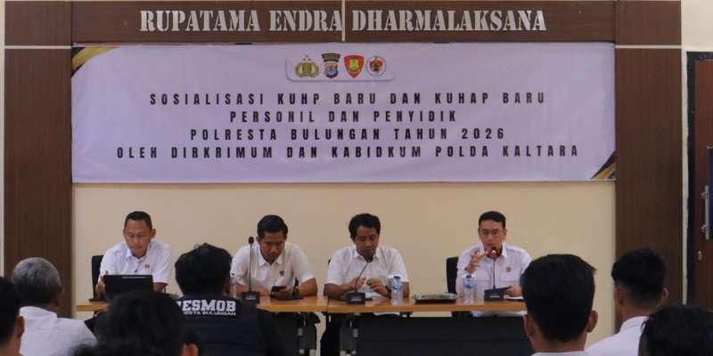 Kapolresta Bulungan Kombes Pol Rofikoh Yunianto, S.I.K., melalui Kasi Humas Aipda Hadi, menyampaikan bahwa kegiatan ini bertujuan untuk memberikan pemahaman yang mendalam kepada seluruh jajaran penyidik mengenai transisi dan implementasi regulasi hukum terbaru di Indonesia.