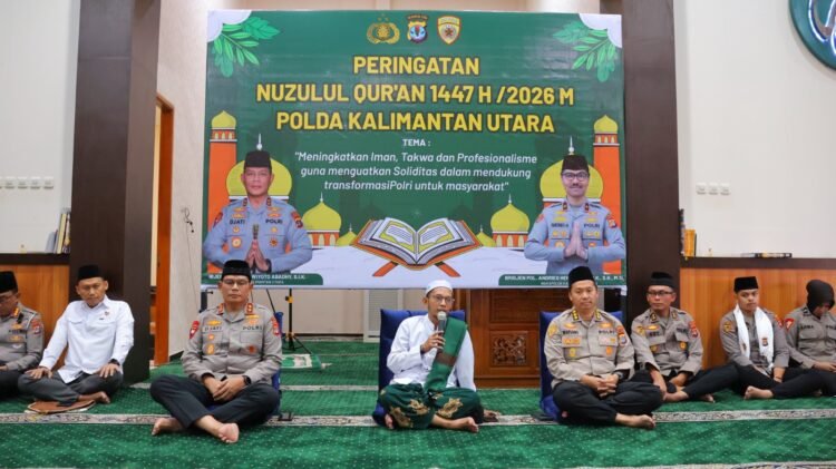 BULUNGAN, Fokusborneo.com  – Kepolisian Daerah Kalimantan Utara (Polda Kaltara) menggelar peringatan Nuzulul Qur’an 1447 Hijriah/2026 Masehi di Masjid Nur Aryaguna Mapolda Kaltara, Senin (9/3/2026). Kegiatan yang berlangsung khidmat tersebut menjadi momentum bagi seluruh jajaran untuk memperkuat keimanan, ketakwaan, serta meningkatkan profesionalisme dalam menjalankan tugas.